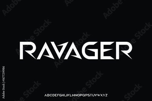 © Asenbayu, Fototapeta premium Modern sharp ravager sans serif alphabet display font vector. Extreme sports typeface
