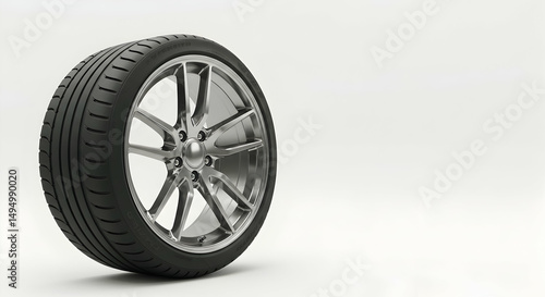 Fototapeta premium Modern Silver Alloy Wheel with Performance Tire on White Background