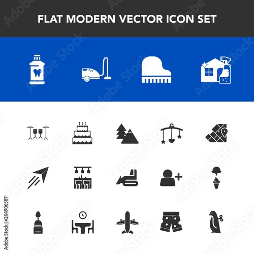 Fototapeta premium Modern, simple vector icon set with hygiene, spray, piano, baby, landscape, mobile, industry, plane, paper, fly, forest, food, bed, flight, geography, travel, newborn, atlas, nature, domestic icons