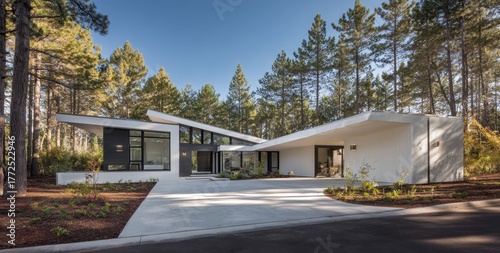 Fototapeta premium Modern single-story angular house in forest.
