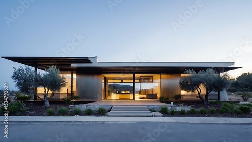 © Marina, Fototapeta premium Modern single-story home at twilight