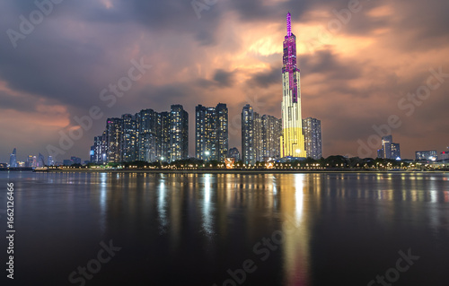© Valentina, Fototapeta premium Modern skyline of Ho Chi Minh City viewed from Cau Ba Son Bridge, showcasing high-rise buildings reflecting the city's rapid urban development