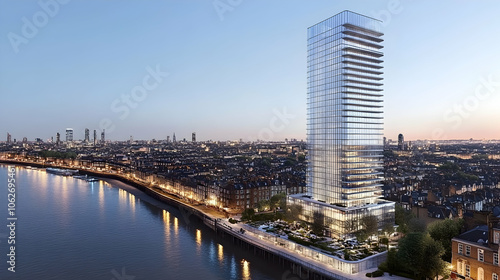© bcendet, Naklejka premium Modern skyscraper on waterfront with cityscape in background at dusk.