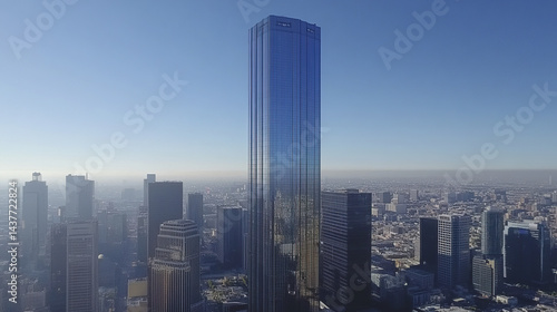 © Thanthara, Fototapeta premium modern skyscraper towers over bustling city skyline, reflecting clear blue sky