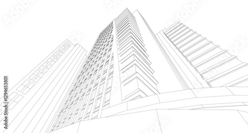 © Svitlana, Fototapeta premium Modern Skyscraper Wireframe. Futuristic Urban Architecture in Abstract Perspective