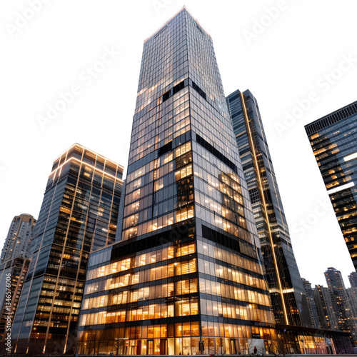 Obraz premium Modern Skyscraper with Glass Facade and Urban Cityscape at Sunset