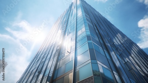 Obraz premium Modern Skyscraper with Glass Facade Reflecting Sunlight and Clouds