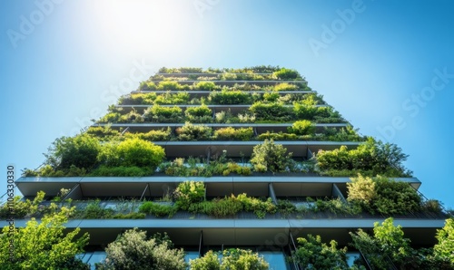 Obraz premium Modern skyscraper with green balconies filled with plants, surrounded by a clear blue sky. Sustainable architecture concept