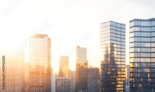 © AhmadTriwahyuutomo, Obraz premium Modern skyscrapers bathed in golden sunlight against a clear sky.