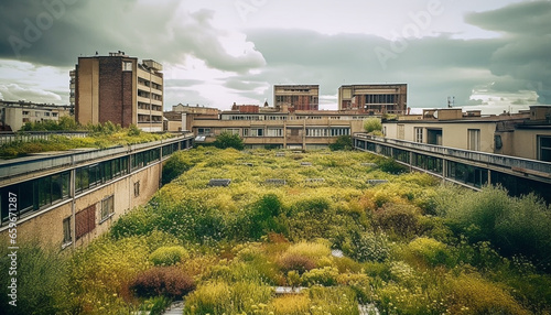 Fototapeta premium Modern skyscrapers dominate city skyline, nature and history vanishing generated by AI