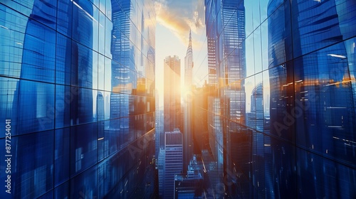 © Nazia, Obraz premium Modern Skyscrapers in Futuristic Financial District with Reflections and Sun Rays