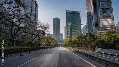 Fototapeta premium Modern skyscrapers lining a wide city road with sleek architecture.