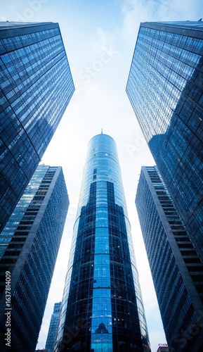 © jiale, Obraz premium Modern skyscrapers reaching towards a clear blue sky, showcasing urban architectural design.