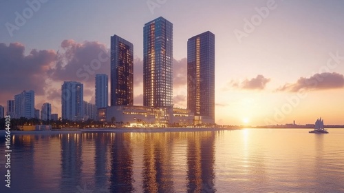 Fototapeta premium Modern Skyscrapers Reflected in Water During Stunning Sunset Glow