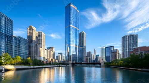 © sungedi, Fototapeta premium Modern Skyscrapers Reflecting on Chicago River