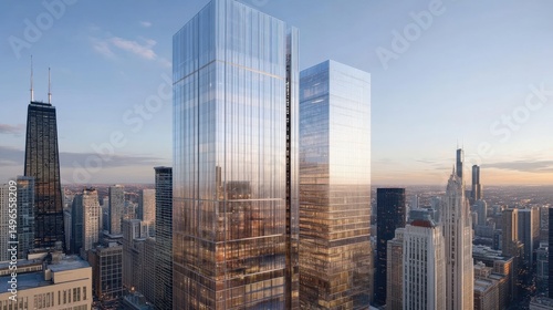 Obraz premium Modern Skyscrapers Reflecting Sunset Over Urban Cityscape