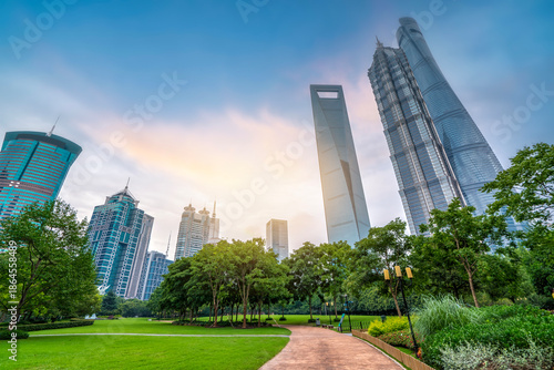 © zhouyilu, Fototapeta premium Modern Skyscrapers with Urban Greenery