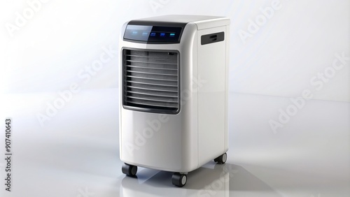 Fototapeta premium Modern sleek portable air conditioner on white background with wheels and digital display surrounded by cool mist and refreshing shadows.