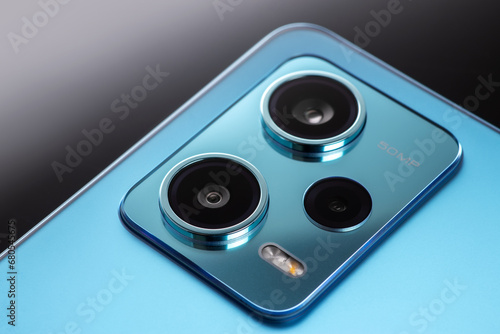 Fototapeta premium Modern smartphone camera lens, macro view. close up