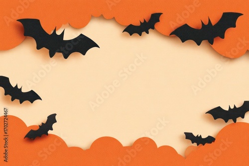 © ZiaUllah, Fototapeta premium Modern smartphone with blank screen surrounded by pumpkins and flying bats on an orange background for halloween
