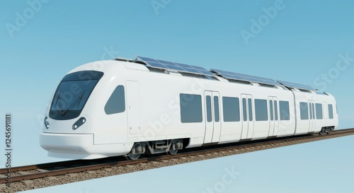 Naklejka premium Modern solar-powered train on elevated tracks against a clear blue sky,...