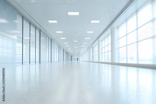 Obraz premium Modern, spacious hallway with large windows, bright lighting, and minimalist...