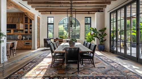 © Athena, Naklejka premium Modern spacious kitchen and dining area with a large table, exposed beams, and abundant natural light from large windows and doors.