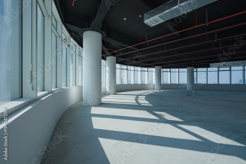 © zhu difeng, Fototapeta premium Modern spacious office interior with curved floor-to-ceiling windows and exposed structural elements