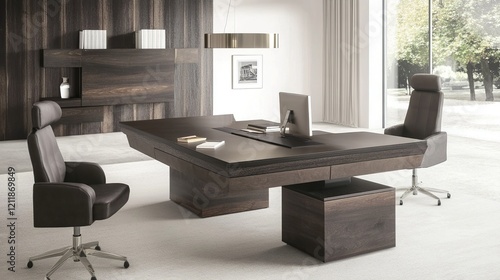 © Windi, Fototapeta premium Modern spacious office with large dark wood desk, two executive chairs, and built-in storage.