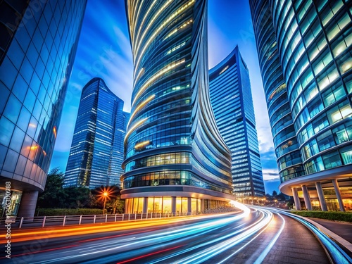 © Arnada, Obraz premium Modern Spiral High-Rise Building, Long Exposure Night Photography