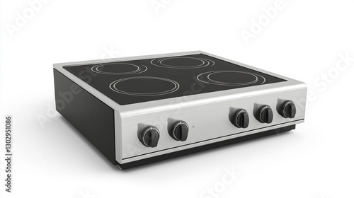 © Johnson, Fototapeta premium Modern Stainless Steel Four Burner Electric Cooktop with Black Controls and Glass Top