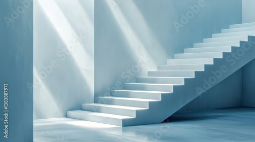 © Eak, Obraz premium modern staircase in minimalist interior, featuring smooth light blue walls and soft shadows creating serene atmosphere. design emphasizes simplicity and elegance
