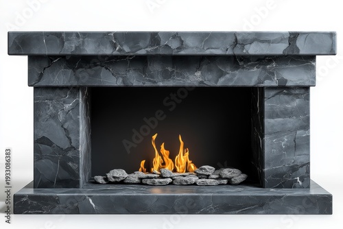 Fototapeta premium Modern stone fireplace with flames and decorative rocks