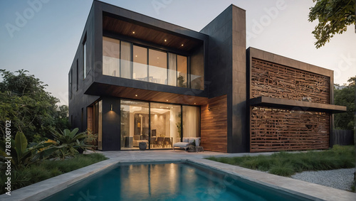 © Digital Art Studio, Fototapeta premium Modern style two-storey luxury house with private swimming pool, Generative ai