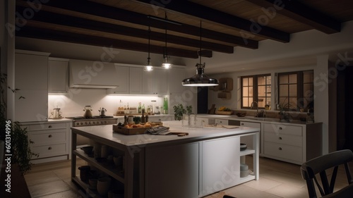 © Georgii, Fototapeta premium Modern stylish white kitchen in a spacious wooden house with large windows and beamed ceilings. A kitchen island with a spacious and comfortable work surface and plenty of kitchen Generative AI