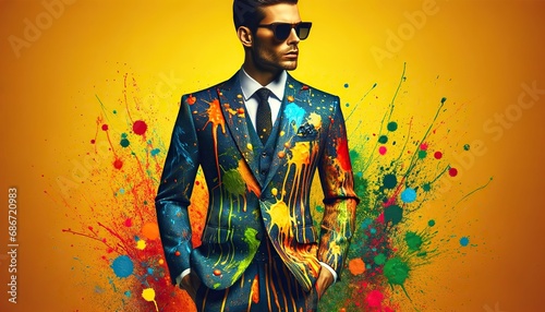 Fototapeta premium Modern suit splashed with colors evokes a festive spirit in a bold fashion statement