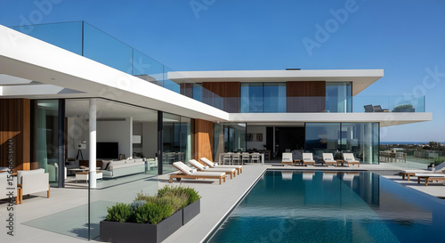 © abu, Fototapeta premium Modern summer villa with infinity pool and rooftop terrace view