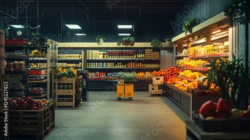 Fototapeta premium Modern supermarket produce aisle with fresh fruits and vegetables in bright...