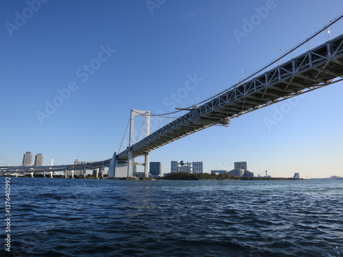 © Narkyy Image, Naklejka premium Modern suspension bridge crossing over deep blue water