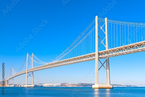 Fototapeta premium Modern suspension bridge spanning a calm blue waterway under a vibrant sky