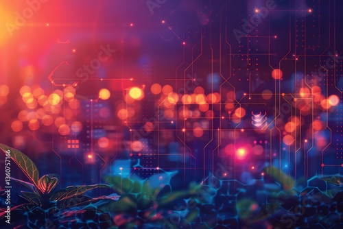 © EpochXstudio, Naklejka premium Modern sustainable future grid illustration with digital vector patterns eco symbols and vibrant gradient overlays representing innovation Grid modern vibrant