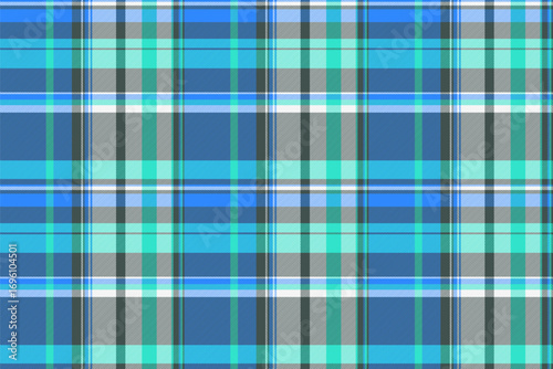 Fototapeta premium Modern tartan pattern in shades of blue, teal, gray and white. Seamless plaid background for textile design, fashion or decoration. Versatile, classic.