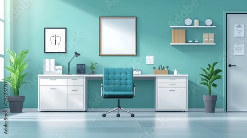 © Almahyra, Fototapeta premium Modern teal office interior with desk, chair, and plants.
