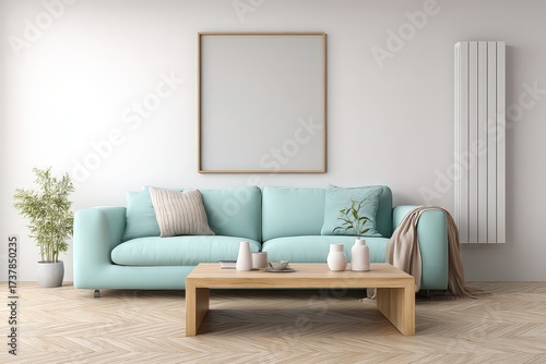 © Rawdah, Fototapeta premium Modern Teal Sofa With Wooden Coffee Table In Empty Room
