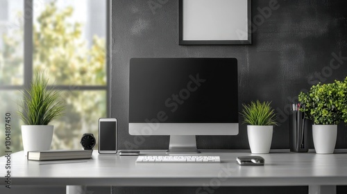 © Nawarit, Obraz premium Modern tech gadgets on a sleek office desk, smartphone and smartwatch visible