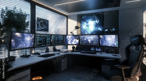 Fototapeta premium Modern tech setup featuring multiple monitors showcasing data, ideal for a...