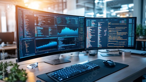 Fototapeta premium Modern Tech Workspace with Advanced Software Displays