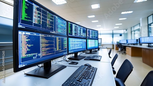 Naklejka premium Modern Technology. Control Room With Multiple Monitors Showing Data Analysis In Empty Office Space.