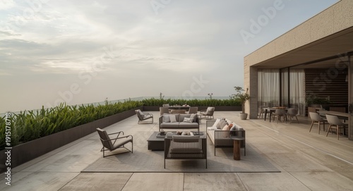 © The 2R Artificiality, Fototapeta premium modern terrace with cloudy sky background and open seating area