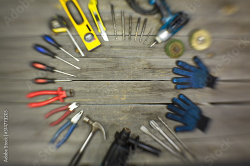 © sovv, Fototapeta premium Modern tools on a wooden table. On the table is: puncher, hammer, pliers, clippers, screwdrivers, measuring tape, level, stationery knife, drills on concrete, drills, electric screwdriver.